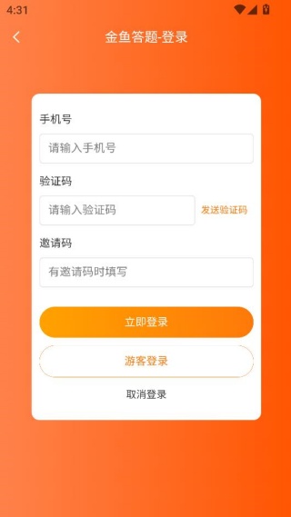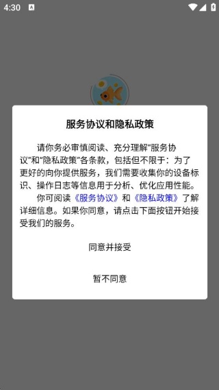 1、在手机应用商店中搜索并下载安装金鱼答题app,查看服务协议内容点击同意并接受。