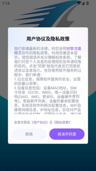 1、在手机上轻松下载并安装锐擎流量精灵app,查阅协议与隐私政策后点击同意。