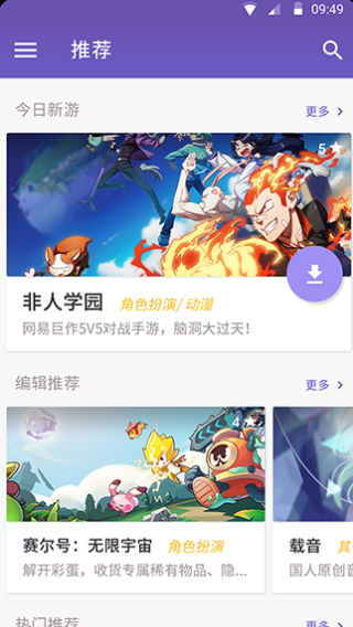 4、来到软件推荐页面,可查看今日新游、编辑推荐等内容。