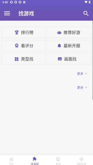 1、来到软件找游戏页面,可查看排行榜、推荐好游、看评分、最新开服等游戏。