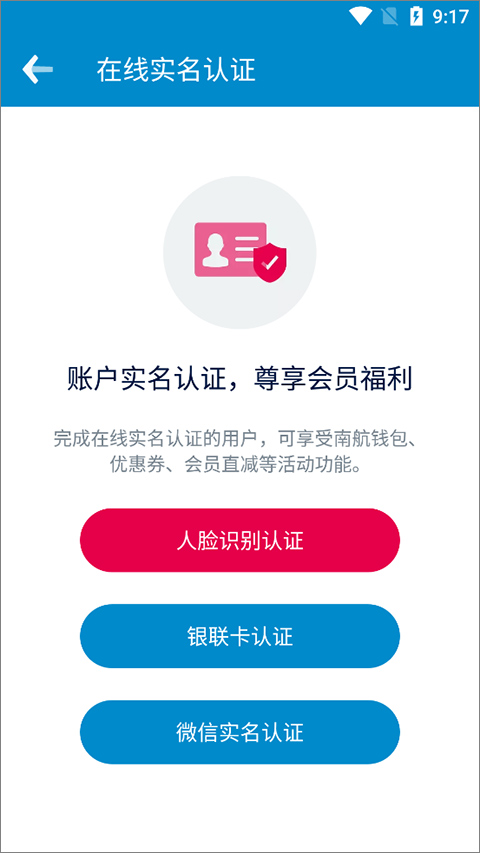 2、接下来会进入实名认证页面,系统为你准备了三种不同的认证途径,包括人脸识别认证、银联卡认证和微信实名认证。你可以根据自己的方便程度任选其一,我们这里以最常用的人脸识别认证为例进行说明。