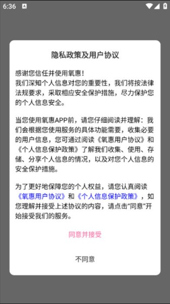 1、首次启动你手机里已经安装好的氧惠购物应用,请先花点时间阅读弹出的隐私政策和用户协议,确认无误后点击“同意”按钮,这样就能顺利进入应用的主操作界面了。