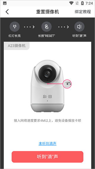 3、在跳转的新页面里,请根据屏幕上的操作指引,确认设备的指示灯状态正常,并且听见设备发出“滴”的一声提示音后,再点击红色的按钮继续。如果你没有听到提示音,可能是摄像头没有成功重置。这时需要重新检查摄像头是否接通电源、指示灯是否亮起,或者再次尝试长按“RESET”键5秒钟,直到听见“滴”声为止。若问题仍未解决,您可前往就近的移动营业厅获取技术支持,或致电客服专线400-110-0868进行咨询。。