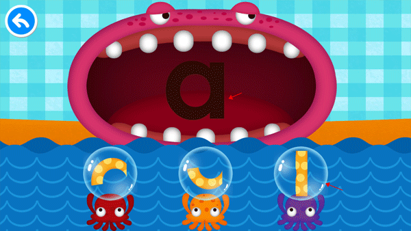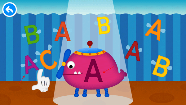7、第三关是考眼力,在一堆字母里把所有的A都找出来,拖到屏幕上的小潜水艇里。全找对了潜水艇就会开走。后面的关卡就照着这个节奏来,一步步把26个字母都过一遍。