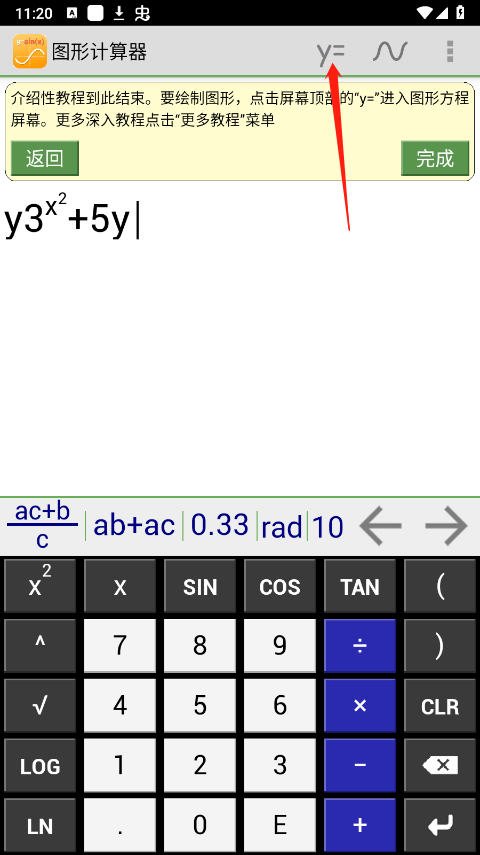 4、咱们来实际操作一下,随便输个方程进去,然后注意看右上角那个“y=”,直接点它就行。