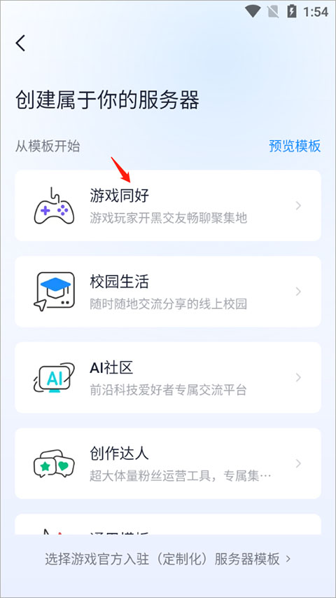 2、接着它会让你选个模板,看看你是想建个游戏社区还是同好会,根据你的需求挑一个。
