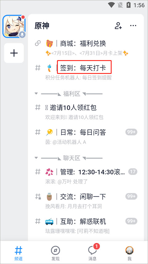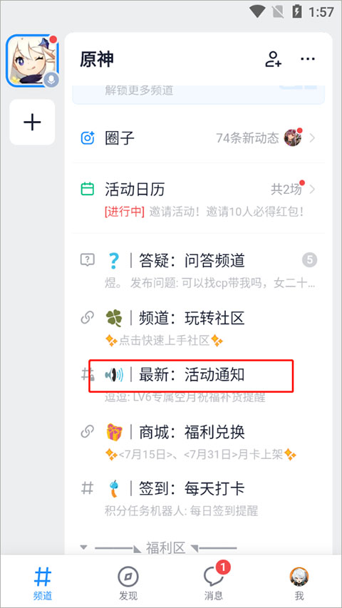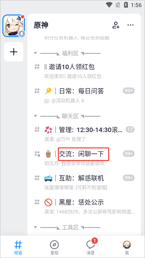 2、没事就去闲聊频道跟大家唠唠嗑,多发言互动也能慢慢攒到积分。