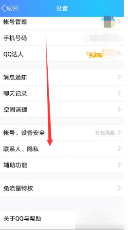 进入设置页面后,能看到好几个选项,咱们要找的是“联系人、隐私”,戳一下它。