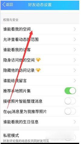打开好友动态的设置界面,咱们直接选“谁能看我的空间”这个选项。
