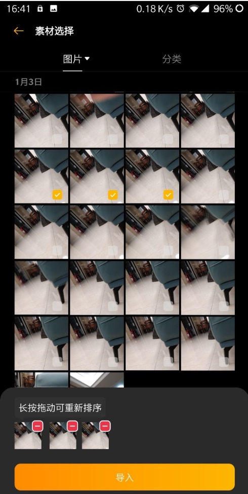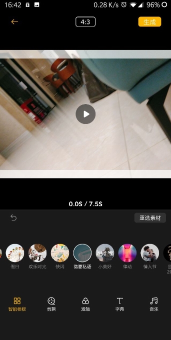 2、直接戳那个“一键生成”,就跳到选素材的界面了。照片视频都能往里扔。