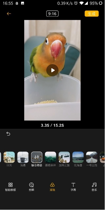 3、点“滤镜”能看到超多不同风格的选项,我个人超爱那个“鎌仓物语”滤镜,很有日系电影感。给视频加字幕和配乐也都在这块操作。