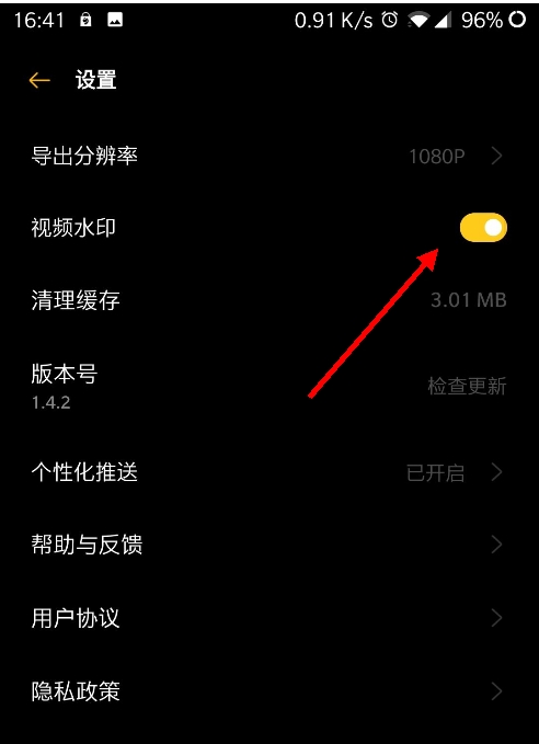 2、在设置菜单里,找到“视频水印”这个选项,把它关掉就大功告成了。