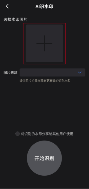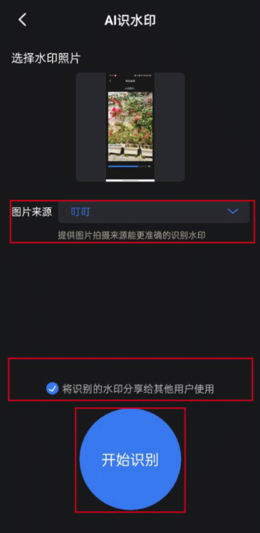 4、这一步稍微要点耐心哈。为了让AI识别得更准,最好是根据这张图的来源,选一下对应的APP名字。对了,底下那个“水印分享”的选项可以勾上,这样你识别出来的水印模板就能分享给朋友用。都搞定后,就点“开始识别”让它跑起来。
