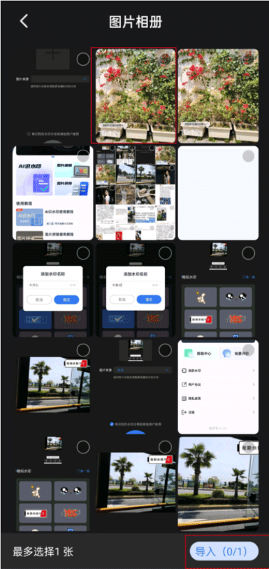 3、然后就跳到你的手机相册了。从里面找到那张你想要识别水印的图片,选中它,再点导入,照片就进到识别功能里了。
