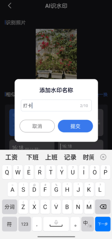 6、点了之后会让你给这个新水印取个名字,方便以后自己找。随便输一个你记得住的,点提交,它就乖乖地存到“我的水印”里去了。