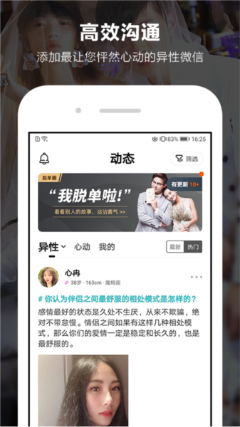 App里有个版块专门分享成功用户的爱情故事,看看别人是怎么从认识到牵手的,沾沾喜气,也给自己点信心,说不定下一个故事的主角就是你。