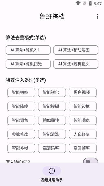 还在为视频搬运头疼?鲁班搭档v5.2安卓版来了!它可不是那种改改MD5的智商税软件,而是用真AI技术深度处理你的视频,实现像素级内容差异。最爽的是,整个去重过程全自动,把视频丢进去就行,省心省力。这款App就死磕视频处理这一件事,功能做得特别深,效率超高,让你的创作和搬运事半功倍。