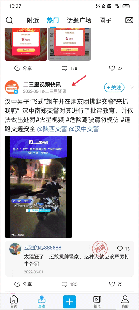(1)打开软件后,底下有好几个菜单,你点那个【身边】,这里面就是各种网友发的帖子和视频。要是看到哪个用户发的内容你特别不喜欢,就随便点开他的一篇帖子。