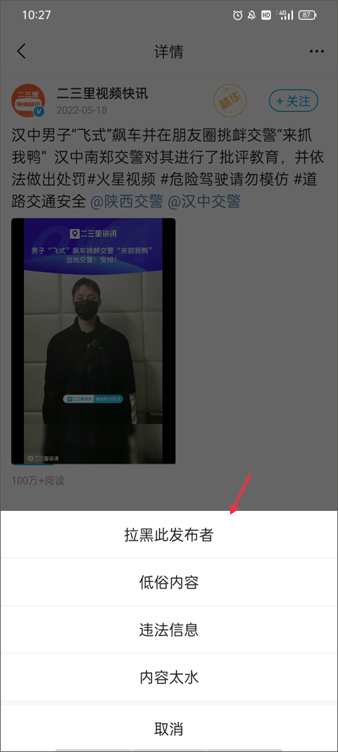 (3)这时候底下会弹出来一个菜单,里面有几个选项。你直接选“拉黑此发布者”就行了。页面刷新一下之后,这个人的所有东西你就再也刷不到了,眼不见心不烦。