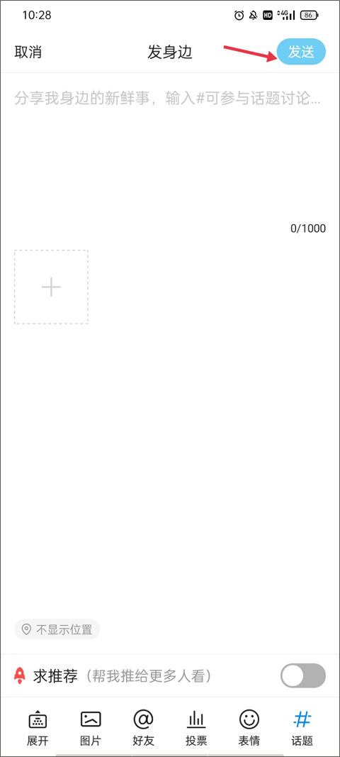 (3)现在就进入编辑界面了,你可以在这里写下你想说的内容,再配上几张手机里的照片。对了,还可以加个话题来增加曝光度,都弄好之后点右上角的“发送”就大功告成了。