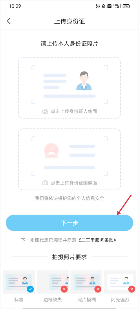 (4)这里就得按它的要求来,把你自己身份证的正反面拍了上传上去,注意看拍摄要求,别拍模糊了。下一步就是上传你们公司的营业执照,跟着它的指引一步步操作,最后提交申请就等着审核通过了。