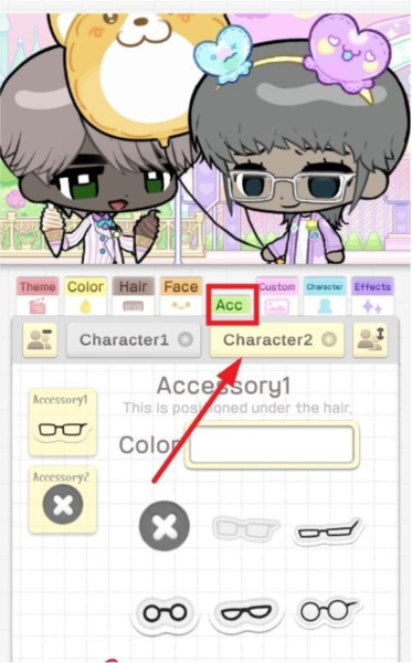 6、如果想让角色看起来更有书卷气或者更酷,可以点击【acc】,这里可以给角色搭配各种款式的眼镜。