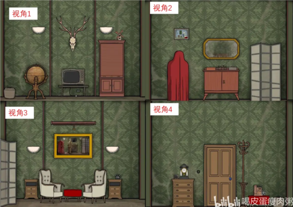 先去视角1,把电视机电源插上,然后看柜子上的小风车。上面亮灯的格子对应风扇上的图案,下面亮灯的位置就是你要转到的地方。搞定后格子会打开,拿到一张纸片(顺便记住风车上的咖啡豆图案,后面磨豆子要用)。