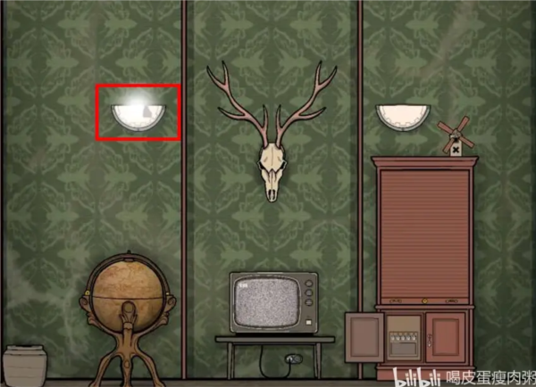 2、去电视机那儿,把频道调到945。电视提示我们去看视角2的油画,还要我们“燃烧灵魂”。掏出雪茄,对着油画里小黑人的脑袋就是一下,烧完拿到一把钥匙。