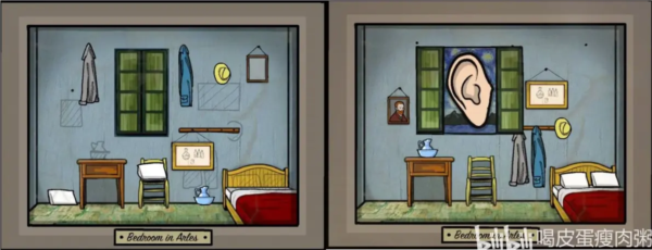 3、回到视角2,把标签贴到油画上。根据画里给出的物品轮廓,把东西的位置调整好。弄完后,窗户会打开,拿到一只耳朵。