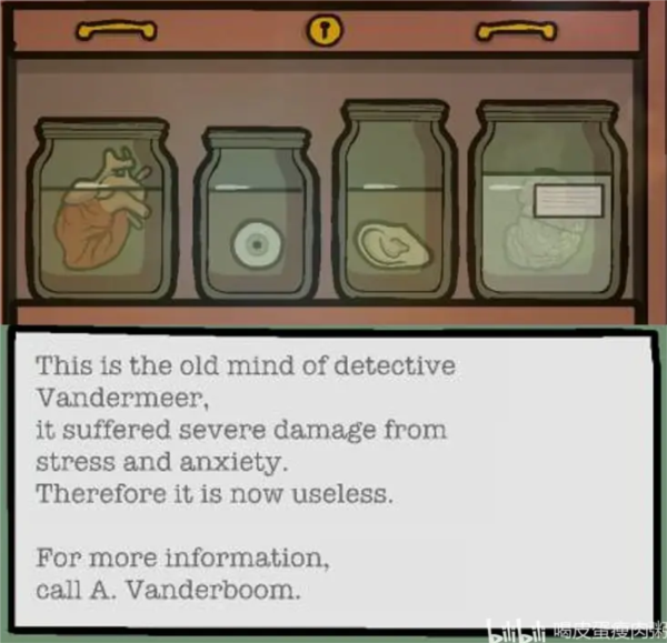用三角钥匙打开视角3的抽屉。左边抽屉是本电话簿,右边是个放大镜(玩到这儿,建议先去做成就,不然通关了再补就得重玩一遍,成就攻略放最后了)。走到镜子前,用刀把自己脑子割开,得到一个旧脑子。去书架第一层,把心脏、脑子、耳朵全泡进福尔马林里,调整它们的位置,让水位在一条线上,具体看图。然后就能看清右边罐子上的标签,提示我们给A.Vanderboom打电话。