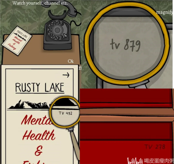 4、去打电话,电话那头让我们去看412频道。看了电视,提示我们用放大镜看电话机旁边的传单,得到线索“TV492”;再看电视,提示去屏风上用放大镜找答案,得到“TV879”;继续看电视,提示我们去看那个钥匙盒,用放大镜看到“TV278”;最后一次看电视,提示去装鱼的抽屉,搞到一枚圆形钥匙。(电视截图我就懒得放了,你们自己去看)
