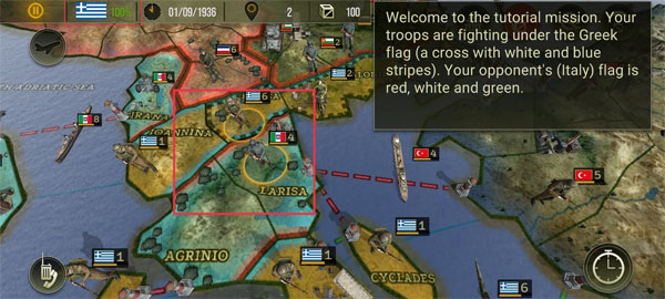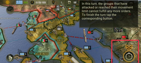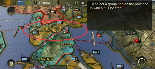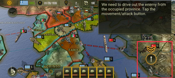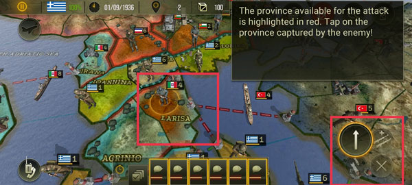 4、当某个区域的边界显示出红色线条时,就意味着你的部队已经可以攻击那里了。先点击敌人所在的区域,再指派周围的友军单位前去支援。选定要攻击的敌军后,别忘了再次点击右下角的按钮来确认你的作战指令。