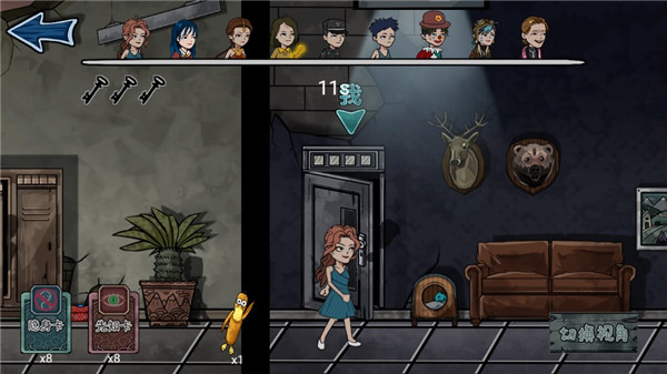 2、这个模式和我们熟悉的玩法不太一样,变身道具是完全随机的,你无法自己选择。游戏开始后,界面上方的镰刀图标代表屠夫总共有10次抓捕机会,换句话说,你必须成功地躲过他10次搜索才能过关。