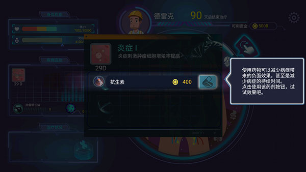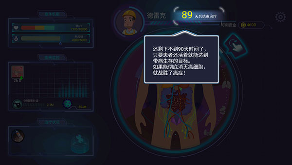 6、看到截图里这个界面没,病人的生命倒计时只剩不到90天了。咱们的目标就是在时间走完前,把癌细胞清零,这就算赢了。