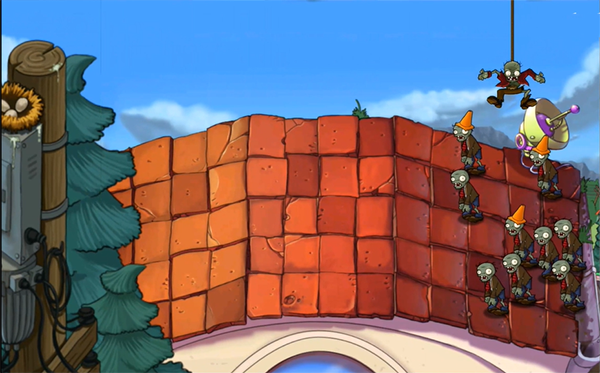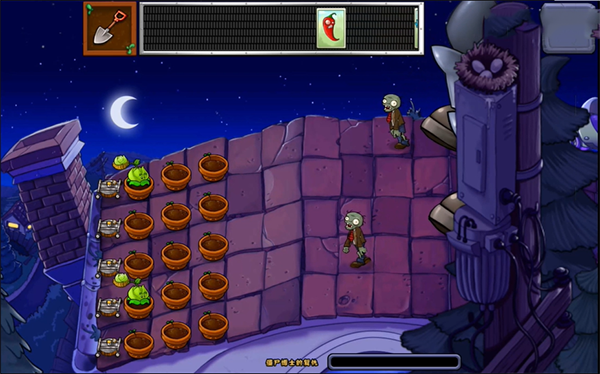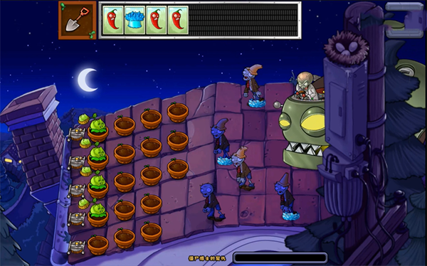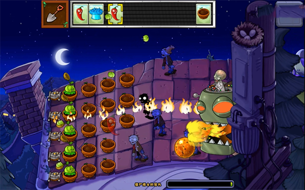 5、这关的玩法变了,僵尸那边会开个大机器人出来放小僵尸,而咱们的植物得种在花盆里,草坪什么的已经不存在了,看下面这张截图就明白了。
