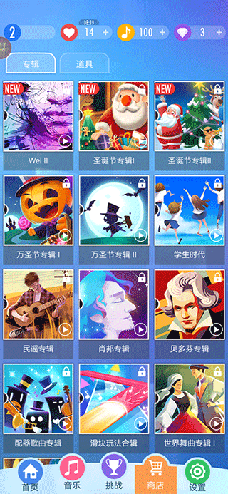 4、如果你想解锁更多好听的歌曲,或者需要购买一些辅助道具,那就去下方的【商店】逛逛吧。在这里,大部分歌曲都可以用钻石来购买。至于道具,虽然有些需要花钱,但我们也可以通过做任务、升级等方式免费弄到手。当然,如果你是土豪玩家,那就随心所欲地买买买吧!