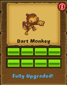 1.飞镖猴 (Dart Monkey):作为游戏中的经典单位,它正是封面图上那个吃着香蕉的主角猴。。射程和射速都中规中矩,纯纯的射气球体验。左边那条升级线,一路点下去就是为了射程和穿透,最后那个主宰者投石机专治各种铁皮和陶瓷气球。右边那条线玩的是数量,从多重飞镖一路点到超猴粉丝俱乐部,能开个技能把周围一圈飞镖猴全变成临时超猴,清场利器。给你们看下它的样子。