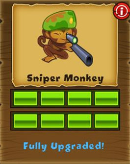 3.狙击手猴 (Sniper Monkey):其优势在于具备全图攻击能力,能够打击任意指定目标,但缺点是攻击速度过慢。。开局建议直接设置成攻击最强的目标,单点能力没得说。左边升级线是纯粹的穿透伤害,点满了连飞艇都能给你打停。右边升级线是提射速和辅助,还能看隐形,最终技能是叫飞机撒钱,属于经济型人才。中后期打陶瓷气球跟玩儿似的,强烈推荐整一个。