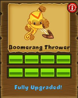 4.回旋镖猴 (Boomerang Thrower):通过投掷沿弧形轨迹飞行的回旋镖进行攻击,其攻击速率中等。。一个镖扔出去能打好几个气球。左边升级线主打一个弹射和多目标,点到月刃领主还能打迷彩,身边常驻俩飞盘,看着就安心。右边升级线是功能性的,能破冰冻和铁皮,最后开技能可以短时间变身加特林,爆发很高。