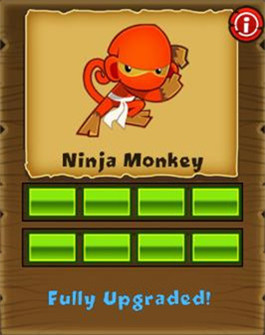 5.忍者猴 (Ninja Monkey):该单位的特点是攻击速度快,并且无需升级即可攻击迷彩目标,非常适合在游戏初期使用,能有效降低开局难度。。左边升级线是强化输出,加射程加攻速,最后能一次扔五个手里剑,跟天女散花一样。右边升级线偏向控制,什么追踪、减速、闪光弹,都是恶心气球的好手,最终技能还能全场减速。下面就是这个神出鬼没的家伙。
