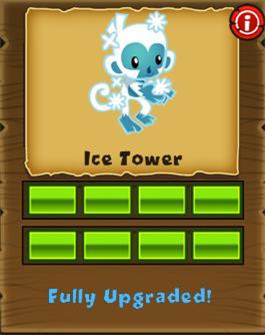 7.冰冻塔 (Ice Tower):其功能是冻结并阻止附近气球的移动,但需要注意,被冻结的目标无法被飞镖伤害,因此讲究单位间的协同作战。。左边升级线是强化控制,加范围加时间,最后还能让减速效果传染。右边升级线是让冰冻带上伤害,能减速能溅射,最终技能“绝对零度”能直接把全屏幕的气球都给冻上,救场神技。