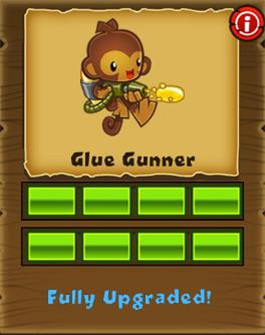 8.胶水猴子 (Glue Gunner):这是一种单体攻击单位,在初始阶段不具备伤害能力,其作用完全是通过喷射胶水来降低气球的移动速度。。左边升级线是给胶水上毒,从持续掉血到最后每秒扒掉十层皮,伤害相当可观。右边升级线是强化减速和范围,让胶水更黏,一次能糊好几个,最后那个全屏泼胶水的技能,面对潮水般的气球有奇效。