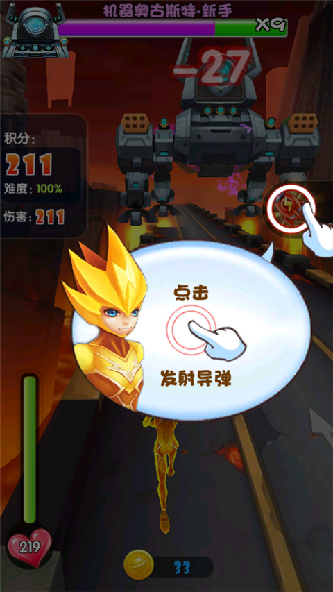 9、快到终点的时候,会出来一个BOSS。这时候你就点BOSS,你的人物就会自动开炮打他。
