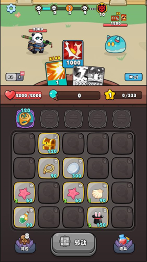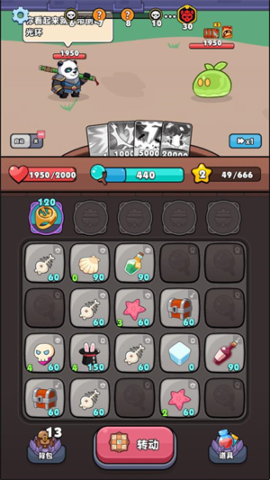 3、选完宝物就开打了。你点那个“转动”按钮,会摇出来一堆棋子,看你摇出来的总分是多少,就打多少伤害,有点老虎机的意思。大家看下面这张截图,就是这么个界面。