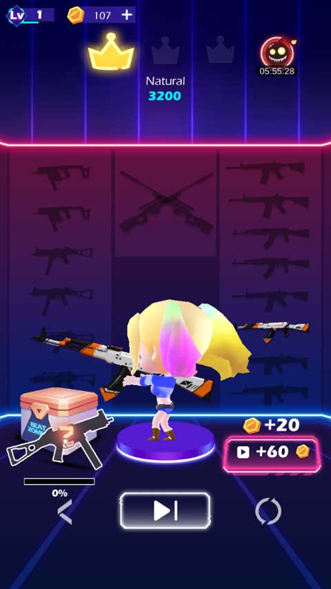 6、回到主界面,你可以换一首歌继续挑战,或者去商店里逛逛。用打关赚的金币能买新的枪械皮肤,或者给你的小丑女换身新衣服,丰俭由人。