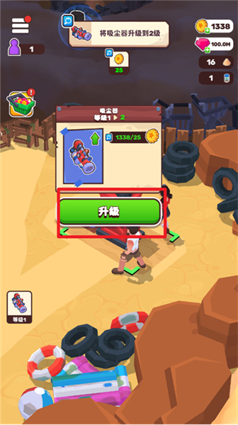 4、救了人别急着走,带着他一起去吸尘器的升级点,给你的宝贝家伙升个级。看到截图里这个界面没,直接点那个大大的【升级】按钮,简单粗暴。