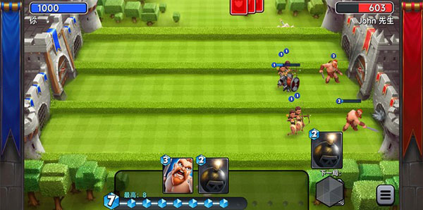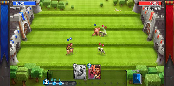 3、用你手里的卡牌把对手的部队清干净,合理下兵是胜利的关键!