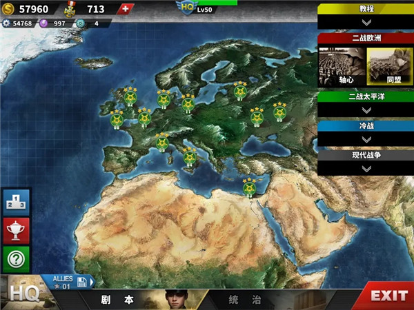 剧本这块,其实就是战役模式,分成了好几个章节:教程、二战欧洲、二战太平洋、冷战和现代战争。二战部分又分轴心国和同盟国。欧洲轴心有11关,主要是德国和意大利的视角;同盟有11关,主角是苏联、英国和美国。太平洋轴心9关,主要是日本;同盟9关,主角是美国。冷战分华约和北约,各6关。现代战争是联合国部队打恐怖组织,目前只有9关,基本把世界大国都囊括进去了。