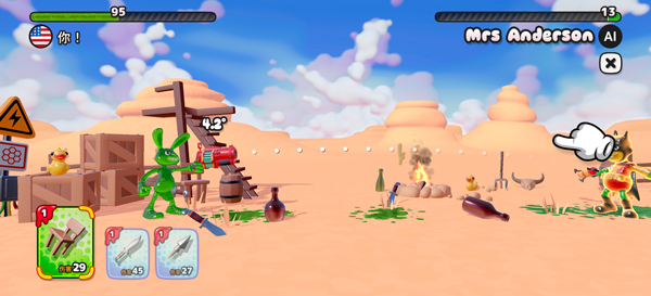 3、玩法是回合制,轮流开炮。地图上能捡的东西都能吸过来当炮弹,对准了就把他轰上天。截图里这哥们就在瞄准。