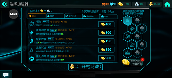 5、如果觉得有点难,可以点开游戏自带的MOD功能,能拿到生化点数,还能给游戏加个速。